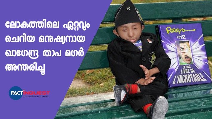 ലോകത്തിലെ ഏറ്റവും ചെറിയ മനുഷ്യൻ എന്ന ഗിന്നസ് റെക്കോർഡ് ഉടമ ഖാഗേന്ദ്ര താപ മഗർ അന്തരിച്ചു. 27 വയസായിരുന്നു. രണ്ടടിയും 2.41 ഇഞ്ചും അഥവാ 67.08 സെൻ്റീമീറ്റര് മാത്രം ഉയരമുള്ള ഖാഗേന്ദ്ര താപ മഗര് ആണ് പൊഖാരയിലെ ആശുപത്രിയില് ന്യൂമോണിയ ബാധിച്ച് മരണപ്പെട്ടത്.