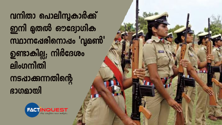 വനിതാ പൊലീസുകാര്ക്ക് ഇനി ഔദ്യോഗിക സ്ഥാനപ്പേരിനൊപ്പം ‘വുമണ്’ എന്ന് ഉപയോഗിക്കില്ല. ലിംഗ നീതി നടപ്പാക്കുന്നതിൻ്റെ ഭാഗമായാണ് നടപടി. ഡിജിപി ലോക്നാഥ് ബെഹ്റയാണ് ഇത് സംബന്ധിച്ച ഉത്തരവ് ഇറക്കിയത്. മുന്പ് വനിതാ പൊലീസുകാരെ വനിതാ പൊലീസ് കോണ്സ്റ്റബിള്, വനിതാ ഹെഡ്കോണ്സ്റ്റബിള്, വനിതാ എസ്ഐ, വനിതാ സിഐ, വനിതാ ഡിവൈഎസ്പി എന്നിങ്ങനെയാണ് അഭിസംബോധന ചെയ്തിരുന്നത്. ഇതിനാണ് ഇനി മുതല് മാറ്റം വരുന്നത്. പുരുഷ പൊലീസിനെ പോലെ സിവില് പൊലീസ് ഓഫീസര്, സീനിയര് സിവില് പൊലീസ് ഓഫീസര് എന്നും ബറ്റാലിയനിലെ വനിതകളെ പൊലീസ് കോണ്സ്റ്റബിള്, ഹവില്ദാര് എന്നുമായിരിക്കും ഇനി മുതല് സംബോധന ചെയ്യുക.