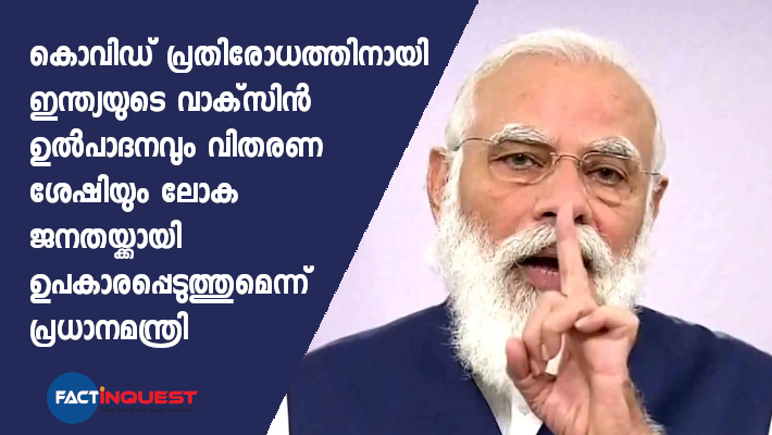 ലോകത്തിലെ ഏറ്റവും വലിയ വാക്സിന് ഉത്പാദിപ്പിക്കുന്ന രാജ്യം എന്ന നിലയില്, ഇന്ന് ആഗോള സമൂഹത്തിന് ഒരു ഉറപ്പ് കൂടി നല്കാന് ഞാന് ആഗ്രഹിക്കുന്നു. കൊവിഡ് പ്രതിസന്ധിയെ നേരിടാന് ഇന്ത്യയുടെ വാക്സിന് ഉത്പാദനവും വിതരണ ശേഷിയും ലോക ജനതയ്ക്കായി ഉപകാരപ്പെടുത്തും’ എന്നും പ്രധാന മന്ത്രി വ്യക്തമാക്കി. രാജ്യത്ത് കൊവിഡ് വാക്സിന്റെ മൂന്നാം ഘട്ട ട്രയല് പരീക്ഷണങ്ങള് നടന്നു വരികയാണെന്നും സുരക്ഷയും കാര്യക്ഷമതയും ഉറപ്പുവരുത്താനായി കൂടുതല് പരീക്ഷണങ്ങള് സഹായിക്കുമെന്നും മോദി വ്യക്തമാക്കി.