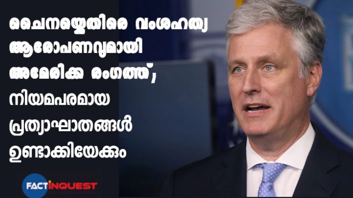 ചെെനയ്ക്കെതിരെ വംശഹത്യ ആരോപണവുമായി അമേരിക്ക രംഗത്തെത്തി. ഷിൻജിയാങ് പ്രദേശത്ത് വംശഹത്യങ്ങൾ അല്ലെങ്കിൽ അതിനോട് അടുത്തുനിൽക്കുന്ന കുറ്റകൃത്യങ്ങൾ നടത്തുന്നുണ്ടെന്ന് യുഎസ് ദേശീയ സുരക്ഷാ ഉപദേഷ്ടാവ് റോബർട്ട് ഓബ്രിയാൻ പറഞ്ഞു. ആസ്പെൻ ഇൻസ്റ്റിറ്റ്യൂട്ട് ആതിഥേയത്വം വഹിച്ച ഓൺലെെൻ പരിപാടിയിൽ സംസാരിക്കുകയായിരുന്നു അദ്ദേഹം. മനുഷ്യമുടി ഉപയോഗിച്ച് നിർമിച്ച നിരവധി ഉത്പന്നങ്ങൾ യുഎസ് കസ്റ്റംസ് പിടികൂടിയിട്ടുണ്ട്. ഉയിഘർ സ്ത്രീകളുടെ തല മുണ്ഡനം ചെയ്ത് മുടി ഉത്പന്നങ്ങൾ നിർമിച്ച് യുഎസിലേക്ക് കയറ്റി അയക്കുകയാണ് ചെെന ചെയ്യുന്നതെന്നും അദ്ദേഹം പറഞ്ഞു.